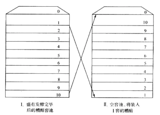 跑窖法工藝,也稱為跑窖分層蒸餾法工藝,以五糧液和劍南春為代表。跑窖是指將發酵完成的糟醅從窖中取出,經加原輔料、蒸餾取酒、糊化、打量水、攤涼冷卻、下曲粉後裝入事先預備好的空窖池中,而不將發酵糟醅放回原窖。窖內發酵完成的糟醅逐甑進行蒸餾,因而稱為分層蒸餾。分層蒸餾有利於量質摘酒和按質並壇等措施的實施。